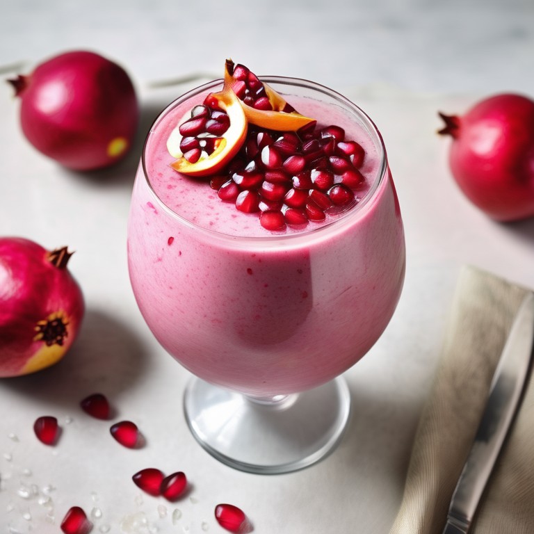A delicious and refreshing smoothie made with tender coconut, pomegranate, milk, and sugar.