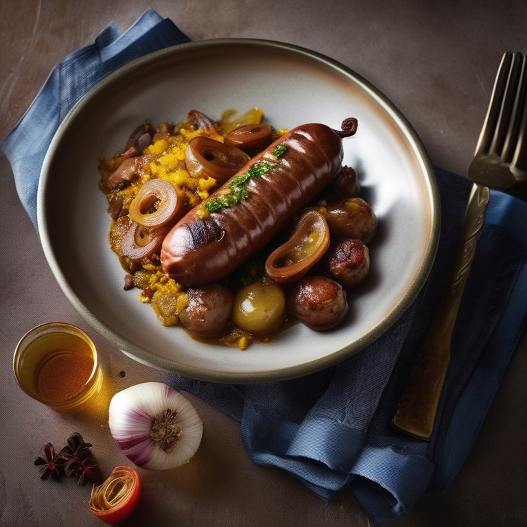 A mouthwatering dish featuring savory sausages with a blend of aromatic spices and caramelized onions.
