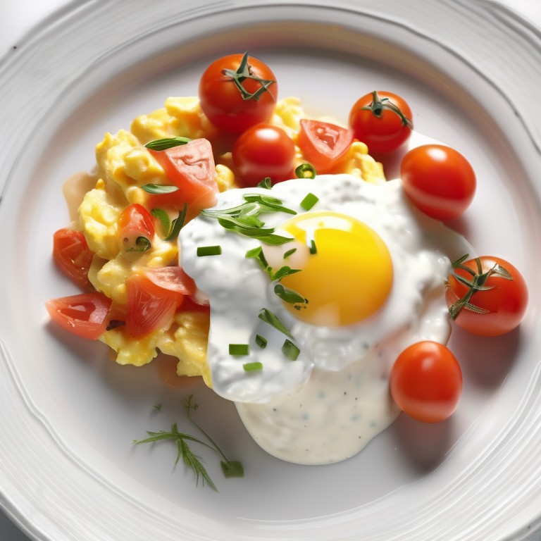Ein köstliches und nahrhaftes Rührei mit Lachs und frischen Tomaten, serviert mit einer cremigen Joghurtsoße.
