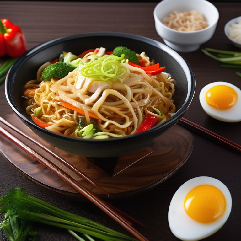 A flavorful and comforting stir-fry dish featuring miki noodles and eggs, enveloped in a rich and savory sauce. This quick and easy recipe showcases the tender bite of miki noodles combined with the soft texture of scrambled eggs, all brought together with an array of aromatic seasonings for a delightful dining experience. Perfect for a simple weekday meal or a satisfying dinner.