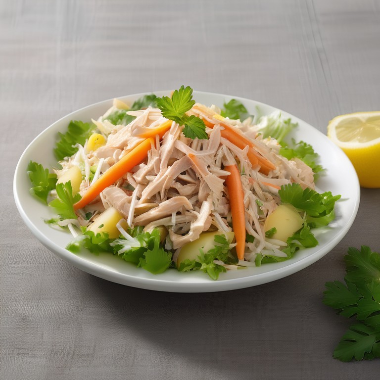 Uma salada refrescante e deliciosa com frango desfiado, batata, cenoura e um molho cítrico de limão