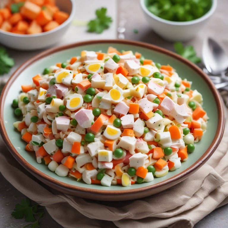 Deliciosa ensalada rusa con una variedad de vegetales frescos y mayonesa cremosa. Perfecta como acompañamiento o plato principal ligero.