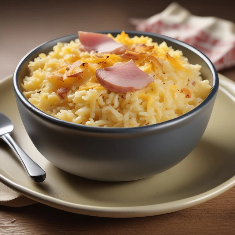 Um prato reconfortante e saboroso de arroz, queijo derretido e presunto dourado, perfeito para toda a família.