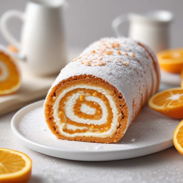 Delicioso postre de Brazo Gitano con un toque refrescante de naranja. Perfecto para ocasiones especiales o simplemente para consentirse.