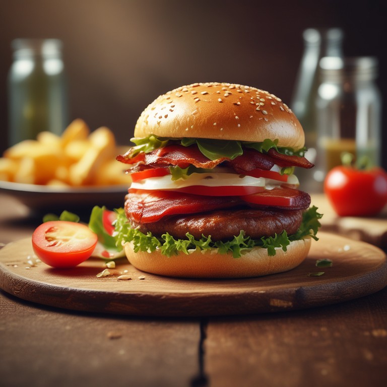 Um delicioso hambúrguer gourmet com uma mistura única de carne de hambúrguer, bacon crocante e frango suculento, acompanhado de tomate fresco, tudo envolto em fatias de pão de forma macias.