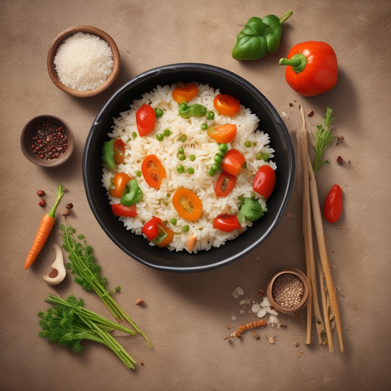 Un plato sencillo y delicioso de arroz precocido con una variedad de vegetales frescos y sabrosos.