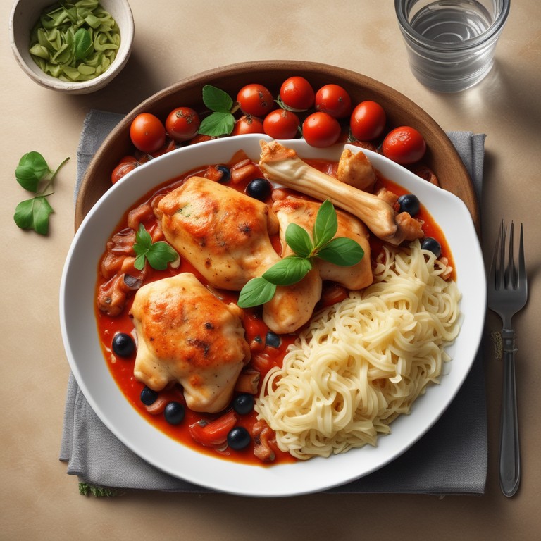 Un délicieux plat français composé de cuisses de poulet tendres, de pâtes, de riz, d'olives et d'une sauce tomate savoureuse. Parfait pour un repas copieux et savoureux en famille.