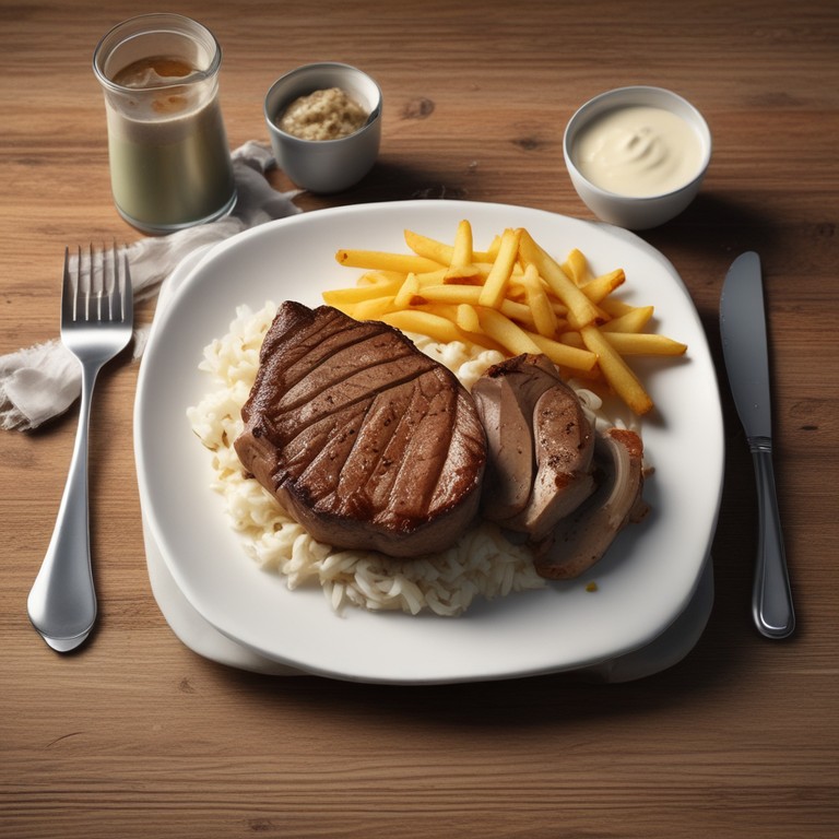 Uma refeição clássica e reconfortante, perfeita para um almoço ou jantar em família. O bife suculento, as batatas fritas crocantes, o arroz soltinho com cebola e a maionese cremosa se combinam para criar uma explosão de sabores. Este prato simples e delicioso certamente agradará a todos os paladares.