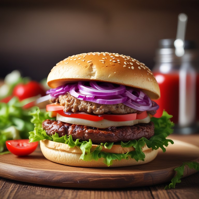 This Spicy Gourmet Hamburger is a flavor-packed delight, featuring a perfectly seasoned beef patty topped with melted pepper jack cheese and a zesty sauce that adds a kick. It's perfect for those who love a little heat in their meals!
