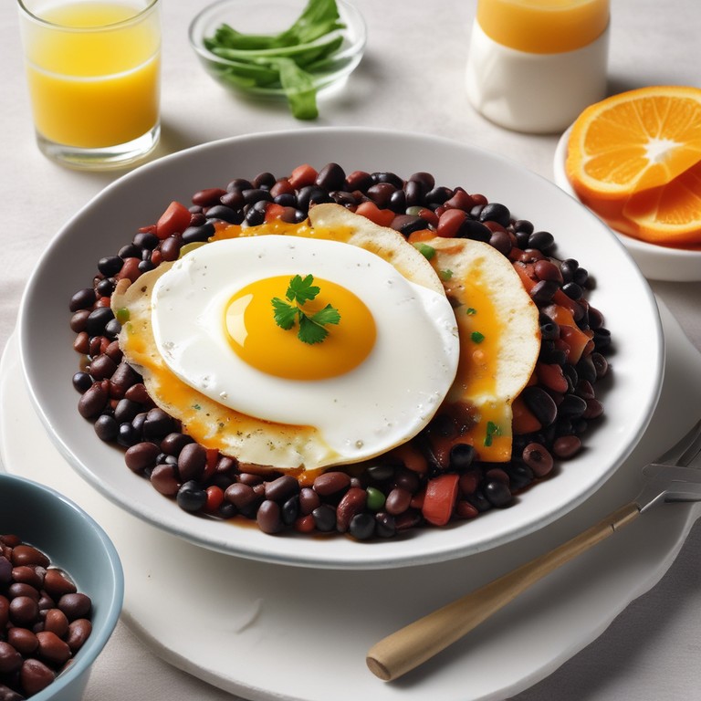 Este plato combina la suavidad de los huevos estrellados con la riqueza de los frijoles negros, creando una experiencia deliciosa y nutritiva. Acompañado de un jugo de naranja fresco, es una opción perfecta para el desayuno o el brunch.
