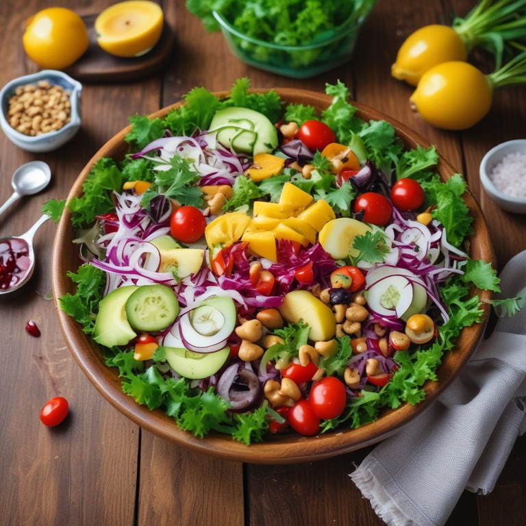 Esta salada tropical é uma opção refrescante e saudável, perfeita para dias quentes. Com uma combinação de folhas verdes, frutas e legumes, ela traz um sabor único e uma explosão de cores ao seu prato. Ideal para servir como acompanhamento ou até mesmo como prato principal leve.