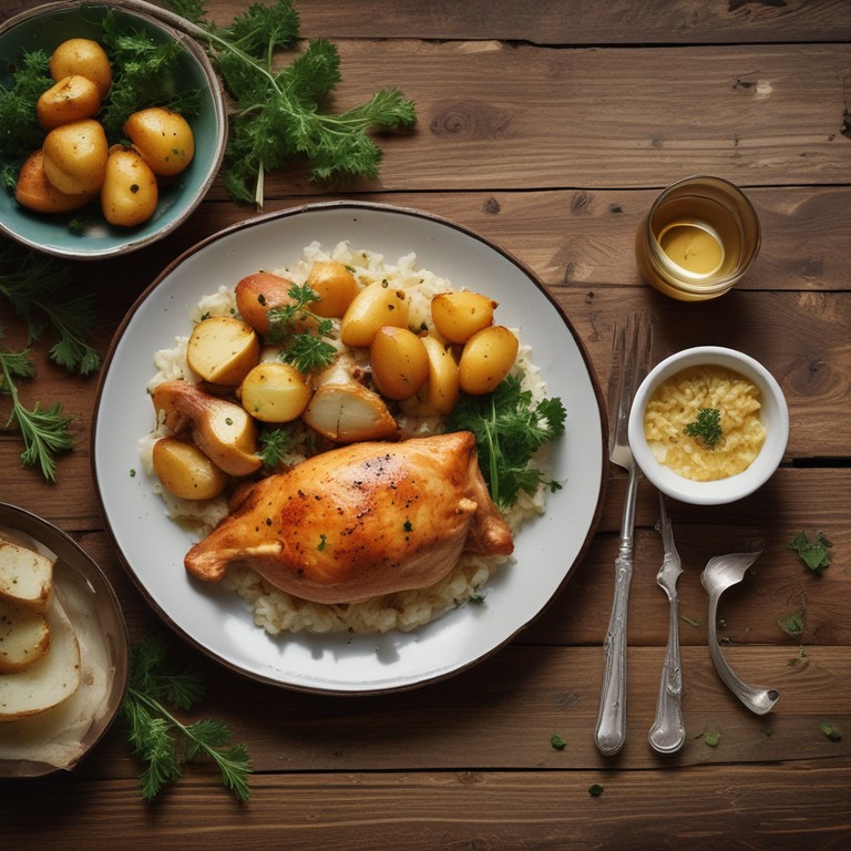 Este delicioso plato de pollo al horno con papas y arroz es perfecto para una comida familiar. El pollo se cocina a la perfección, mientras que las papas y el arroz absorben todos los sabores. Ideal para cualquier ocasión.