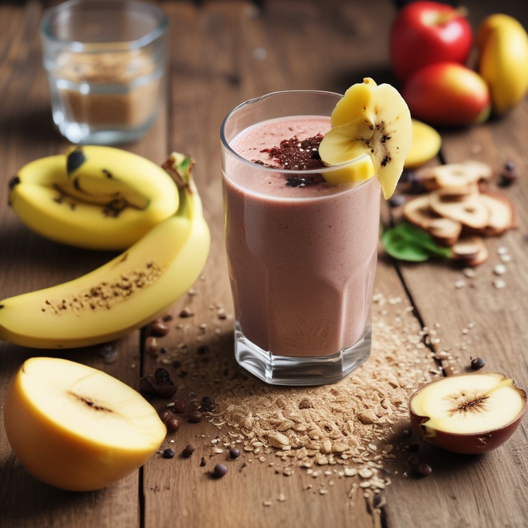 Um smoothie delicioso e nutritivo, perfeito para um lanche ou café da manhã, combinando o sabor doce da banana e da maçã com o chocolate do whey protein e a textura da farinha de aveia.