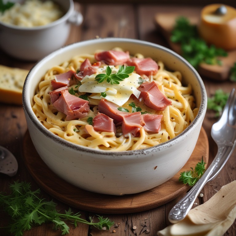Um prato de macarrão cremoso e saboroso, recheado com queijo, presunto e carne moída, perfeito para um almoço em família.