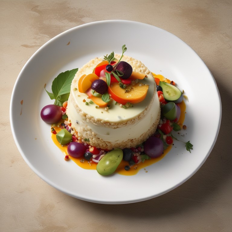 Este timbal de quinoa con verduras asadas y salsa de yogur de limón es un plato gourmet que combina texturas y sabores sorprendentes, ideal para impresionar a los jueces en un concurso de cocina.