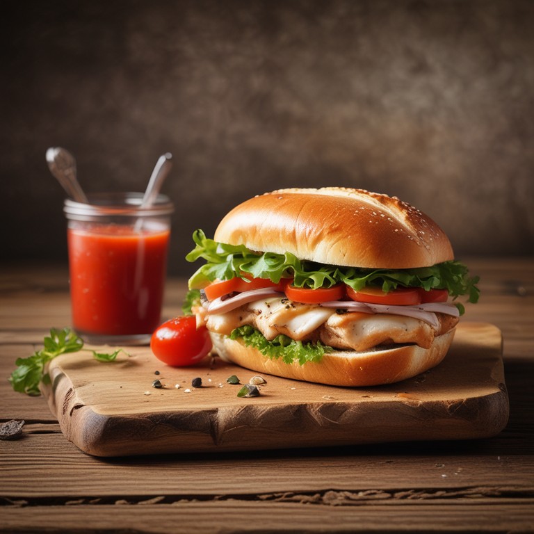 Um delicioso sanduíche de frango sassami, acompanhado de batatas fritas crocantes e um molho de tomate caseiro, perfeito para um lanche ou refeição rápida.