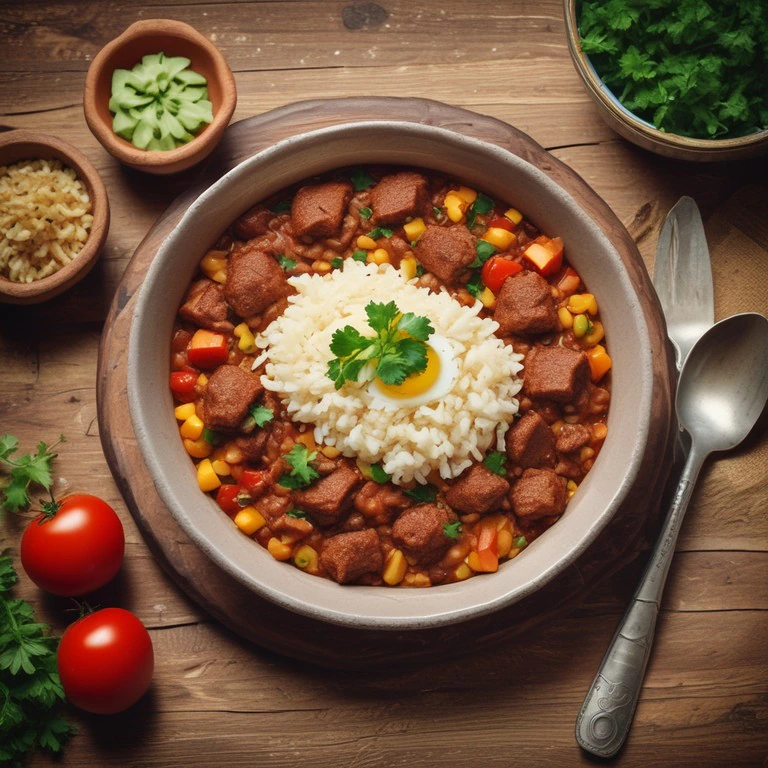 Um prato saboroso e reconfortante, perfeito para um almoço em família, combinando carne moída, milho e arroz com um molho de tomate delicioso.