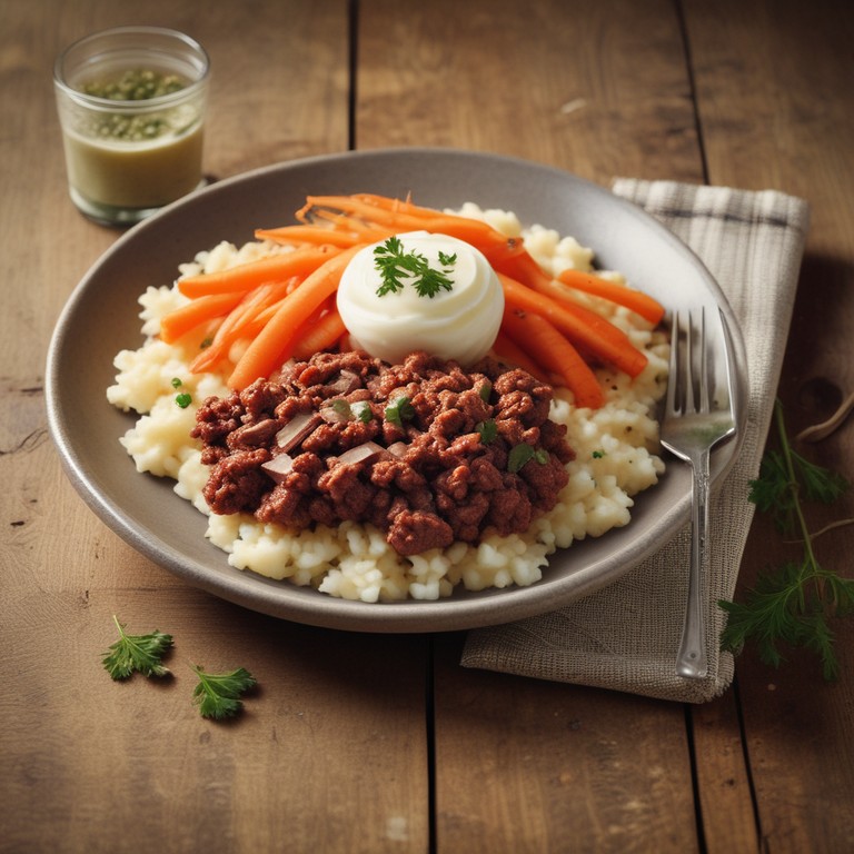 Uma refeição completa e nutritiva, perfeita para o dia a dia, combinando carne moída com cenoura, arroz integral e um cremoso purê de batata inglesa.
