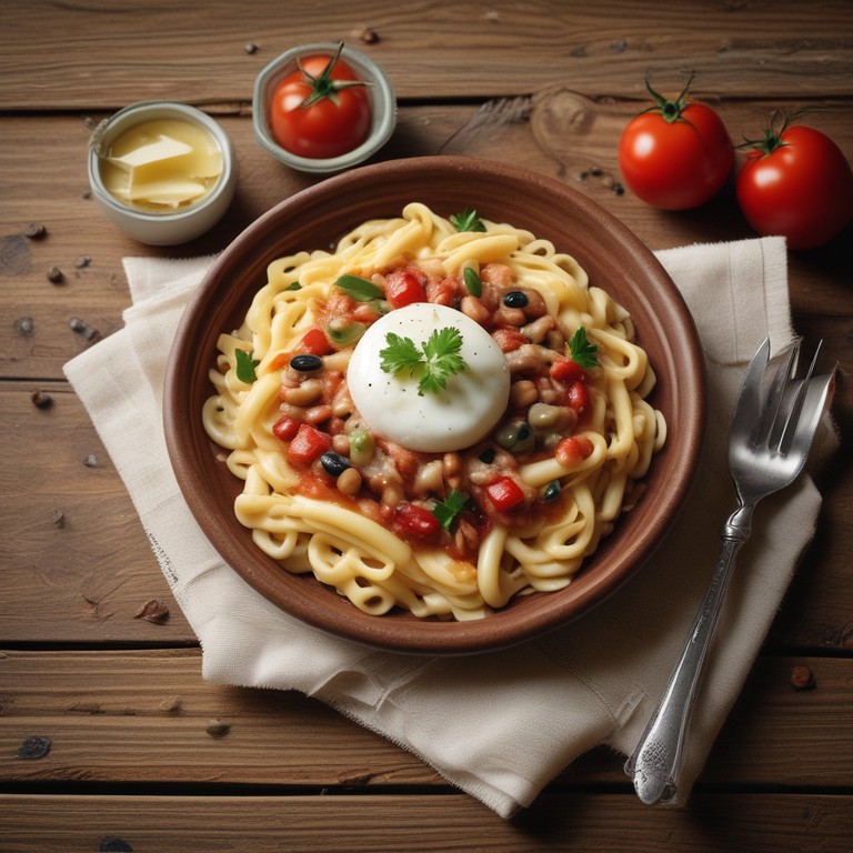 Um prato delicioso e cremoso de macarrão com molho de tomate e queijo, perfeito para um almoço em família.