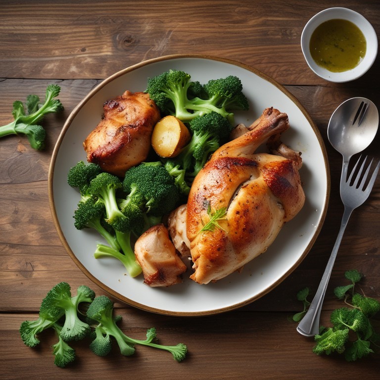 Este delicioso plato combina la jugosidad del pollo asado con la textura crujiente de las papas y la frescura del brócoli, todo cocido al horno para un sabor excepcional.