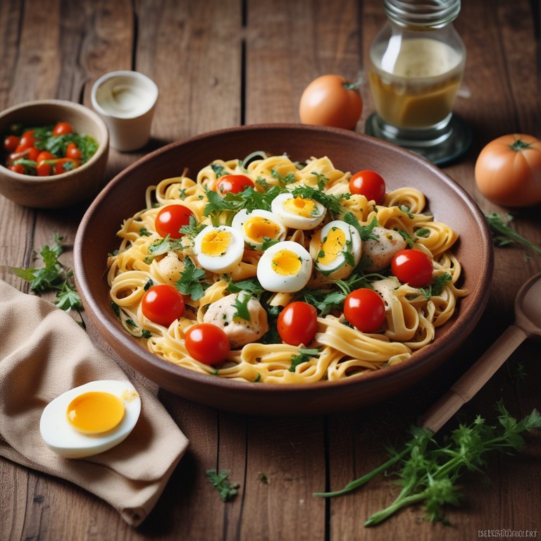 Uma combinação deliciosa de macarrão com peixe e ovos, envoltos em um molho de tomate fresco, perfeito para um almoço ou jantar leve.