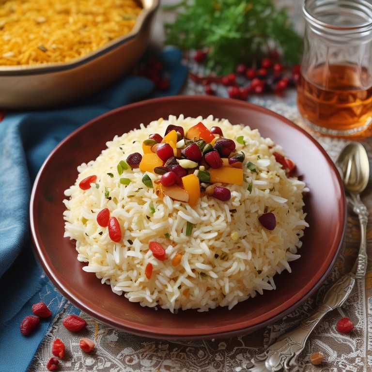 Ein traditionelles persisches Gericht, das durch die Kombination von duftendem Safranreis und süß-sauren Berberitzen besticht. Die gerösteten Mandeln und Pistazien verleihen dem Gericht eine knusprige Textur und einen nussigen Geschmack. Perfekt als Beilage oder Hauptgericht.