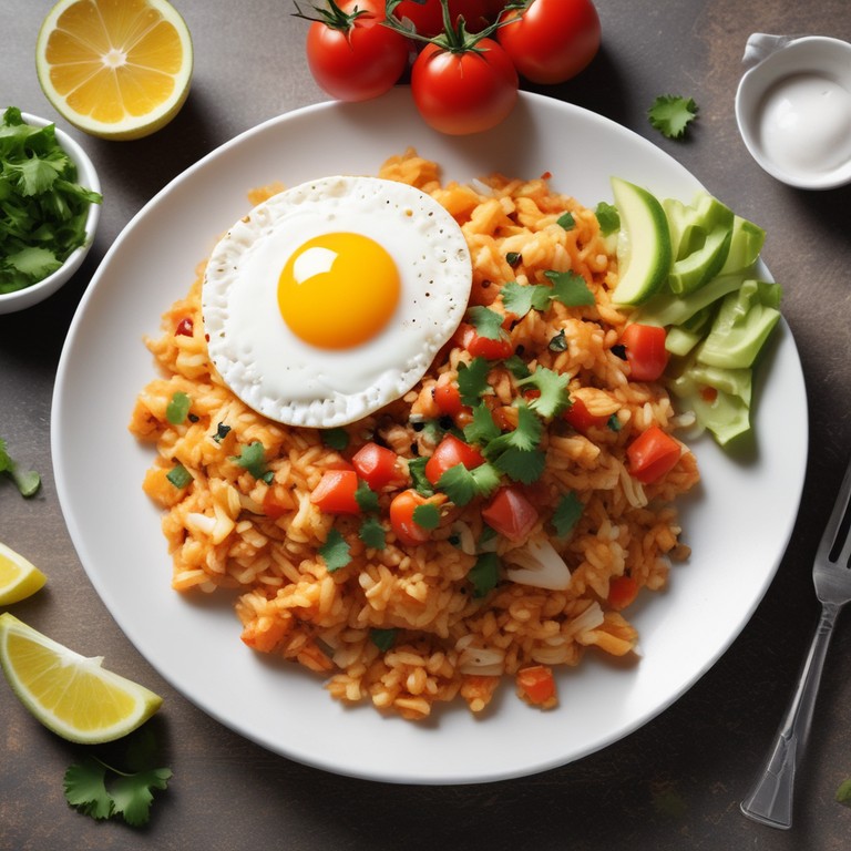 Este delicioso plato combina arroz esponjoso con huevos fritos y una salsa de tomate fresca, ideal para un desayuno o almuerzo sustancioso.