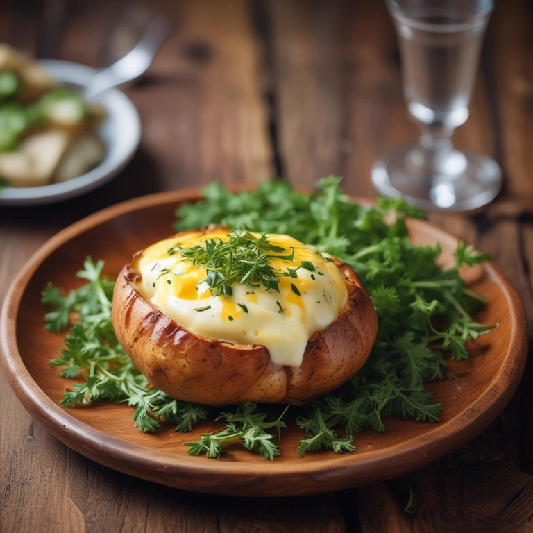Uma deliciosa batata recheada com queijo muçarela e ervas finas, perfeita como acompanhamento ou prato principal.