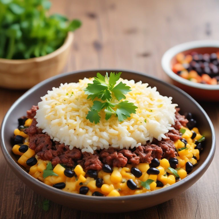 Um prato típico brasileiro que combina arroz, carne moída, feijão e queijo, perfeito para um almoço ou jantar em família.