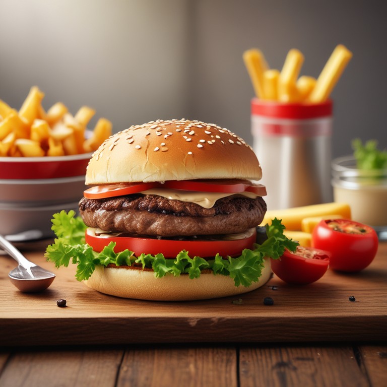 Um hambúrguer clássico feito com carne suculenta, servido em pão de forma com um molho especial, tomate fresco e acompanhado de batatas fritas crocantes. Perfeito para um almoço ou jantar descontraído!