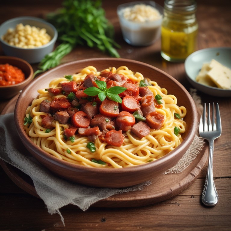 Um prato de macarrão cremoso e saboroso, perfeito para um almoço ou jantar especial, combinando a riqueza do bacon e da linguiça com um molho de tomate e creme de leite.