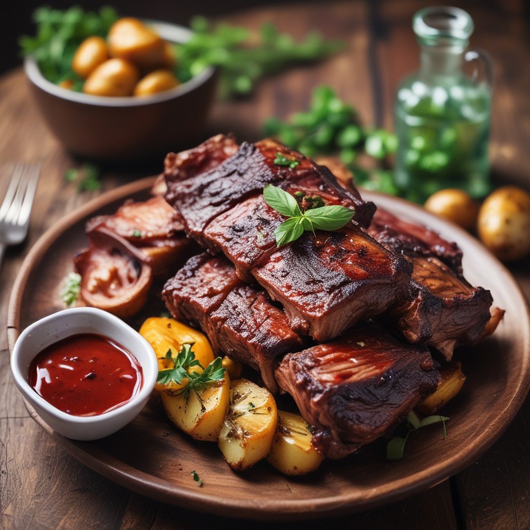Uma deliciosa receita de costela bovina assada com molho barbecue, acompanhada de batatas rústicas crocantes, perfeita para um almoço em família ou um churrasco.
