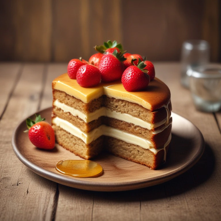 Um bolo doce e úmido de banana com pedaços de morango, adoçado com mel, perfeito para um lanche ou sobremesa.