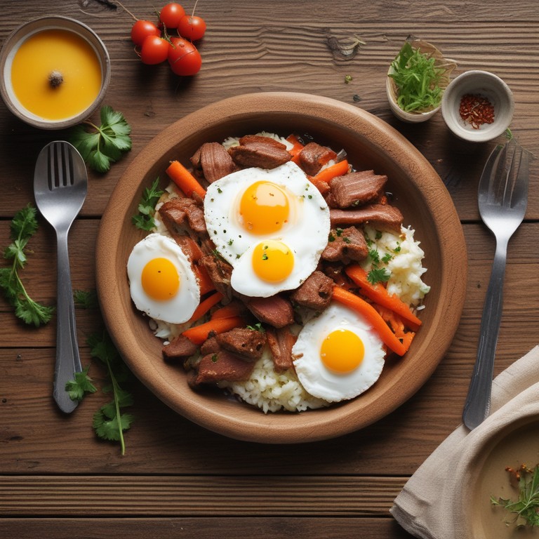 Um prato saboroso e nutritivo que combina arroz, carne, legumes e ovos, perfeito para uma refeição completa e reconfortante.