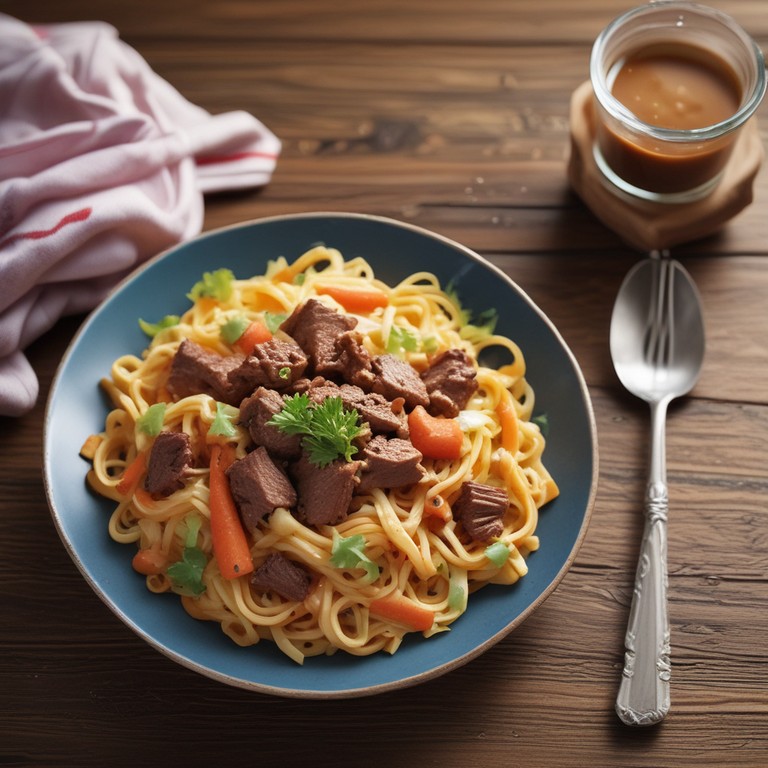 Um prato saboroso de macarrão com carne paleta bovina e legumes, temperado com molho shoyo, perfeito para um almoço ou jantar nutritivo.
