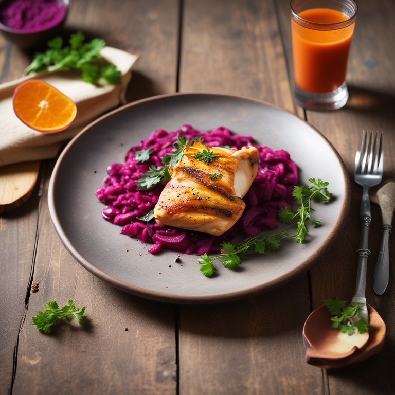 Uma combinação deliciosa de filé de frango grelhado com purê de beterraba e batata doce, perfeita para um jantar saudável e colorido.