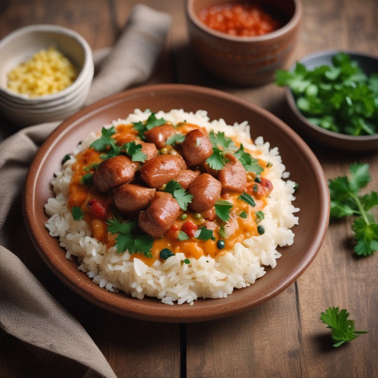 Um prato saboroso que combina arroz com calabresa, um molho cremoso de leite e feijão, perfeito para um almoço em família.