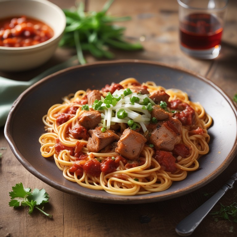 Uma combinação deliciosa de espaguete com um molho de tomate rico, acompanhado de filé mignon suíno suculento e finalizado com cebolinha fresca. Perfeito para um jantar especial!
