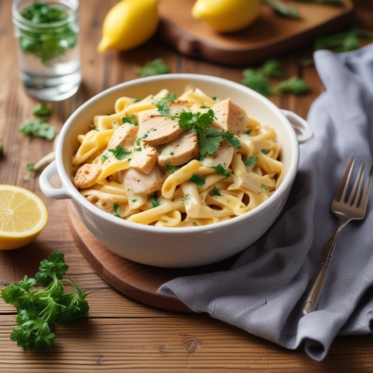 Um prato de macarrão cremoso e saboroso, feito com peito de frango, requeijão e um toque de limão, perfeito para um almoço ou jantar especial.