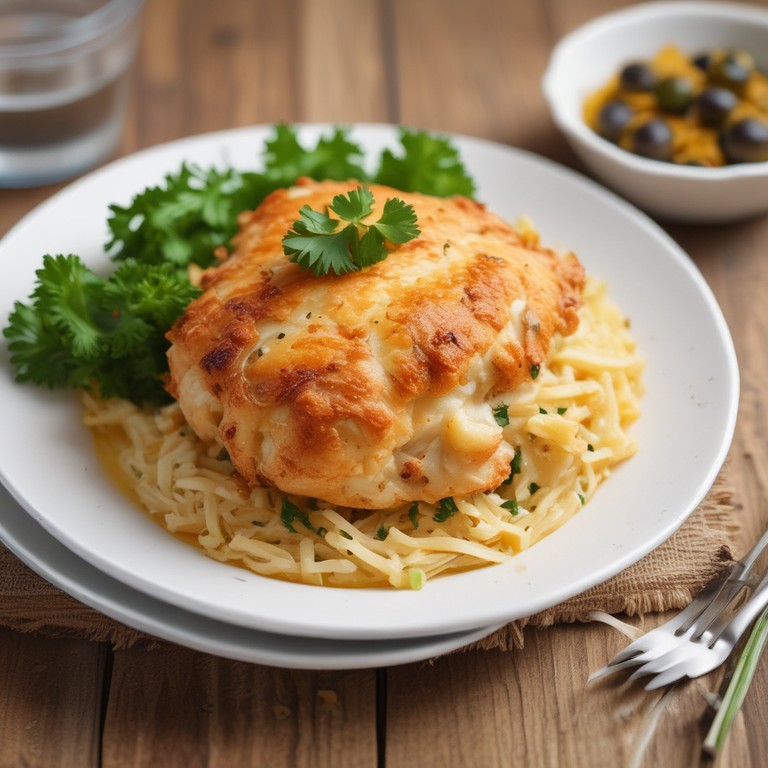 Um delicioso pastel recheado com peito de frango desfiado, queijo e azeitonas, perfeito para um lanche ou entrada.