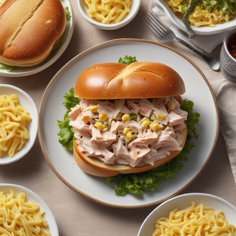 Um sanduíche delicioso e nutritivo, perfeito para um lanche ou refeição leve, combinando atum, milho e macarrão em um pão brioche macio.