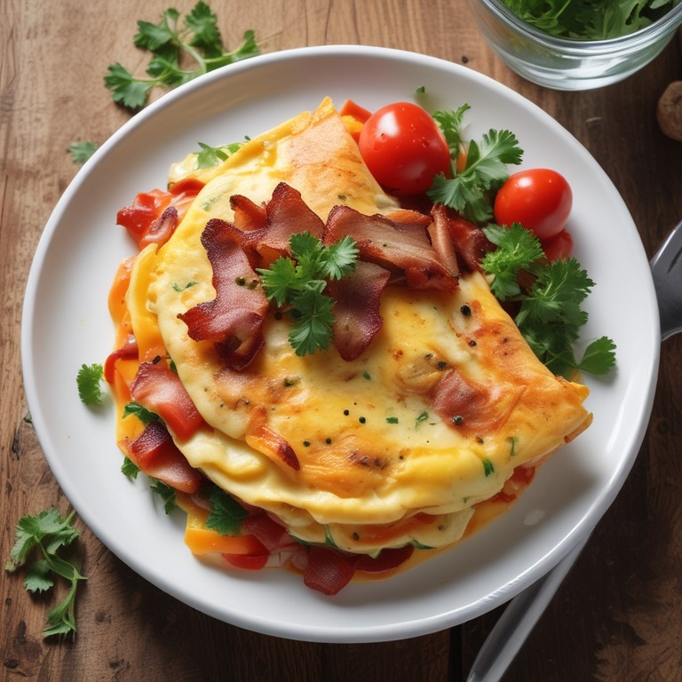 Uma omelete deliciosa e recheada com bacon crocante, queijo derretido e legumes frescos, perfeita para um prato principal rápido e saboroso.