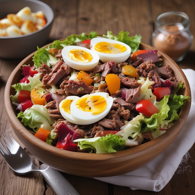 Uma salada nutritiva e colorida que combina carne moída com uma variedade de vegetais frescos e ovos, perfeita para uma refeição leve e saudável.
