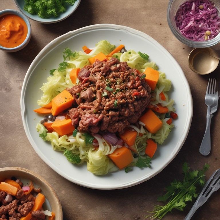 Um prato nutritivo e saboroso, perfeito para uma refeição completa, combinando a proteína da carne moída com a doçura da batata doce e a crocância do repolho.