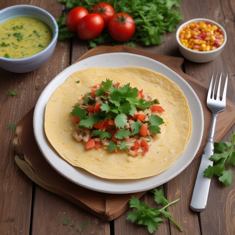 Una deliciosa tortilla de maíz rellena de una mezcla de huevos, atún y queso, perfecta para un desayuno o almuerzo rápido y nutritivo.