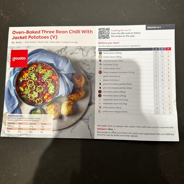 A plant-based, gluten-free, and dairy-free dish featuring a hearty three bean chilli served with crispy jacket potatoes.