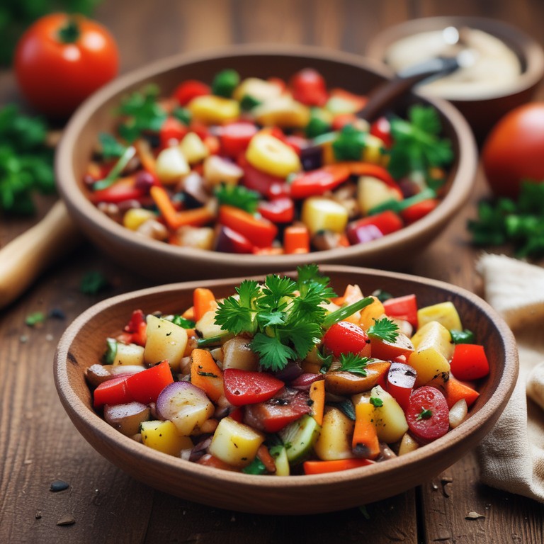 Um delicioso e nutritivo refogado que combina batatas, cenouras, tomates e cebolas, perfeito como acompanhamento ou prato principal leve.