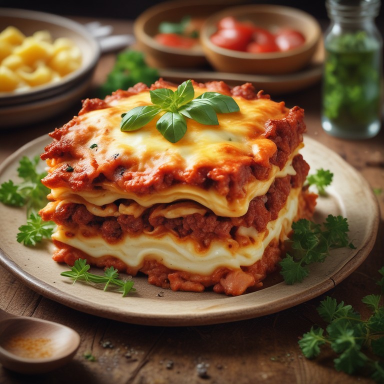 Uma deliciosa lasanha recheada com carne moída, presunto e queijo, perfeita para um almoço em família ou um jantar especial.