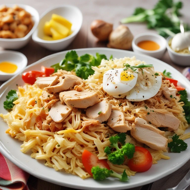 Uma receita saborosa de frango desfiado com legumes, acompanhada de arroz e macarrão, perfeita para um almoço nutritivo e reconfortante.