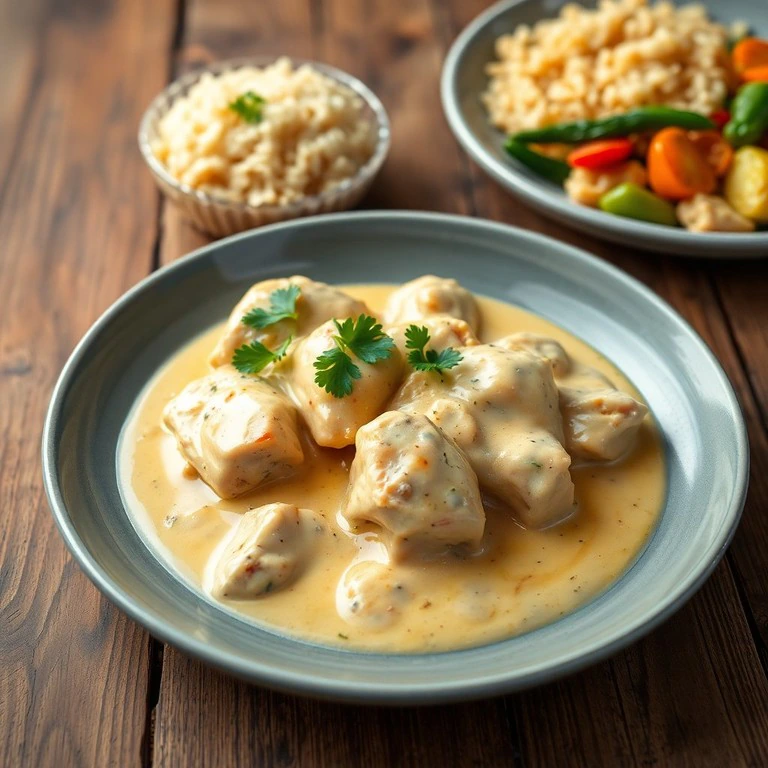 Um prato delicioso e cremoso de frango, envolto em um molho de leite condensado e creme de leite, perfeito para um almoço especial.